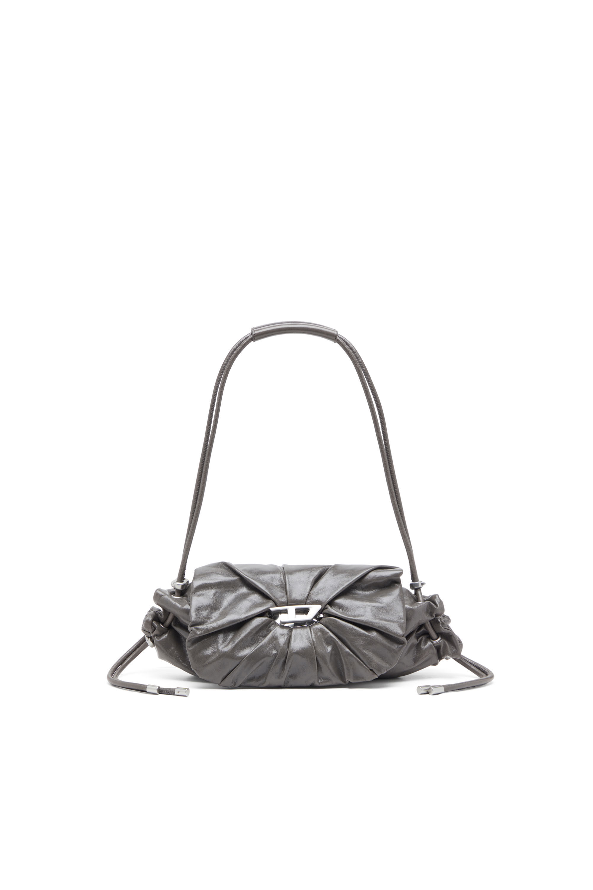 Women's shoulder bag made from shiny, wrinkled leather, taking cues from sports tracksuits. Scrunching on the flap adds unique texture, anchored with a mirror-backed Oval D plaque for captivating depth. Cinched and secured with toggle drawstrings, bound together at the top to act as a handle.